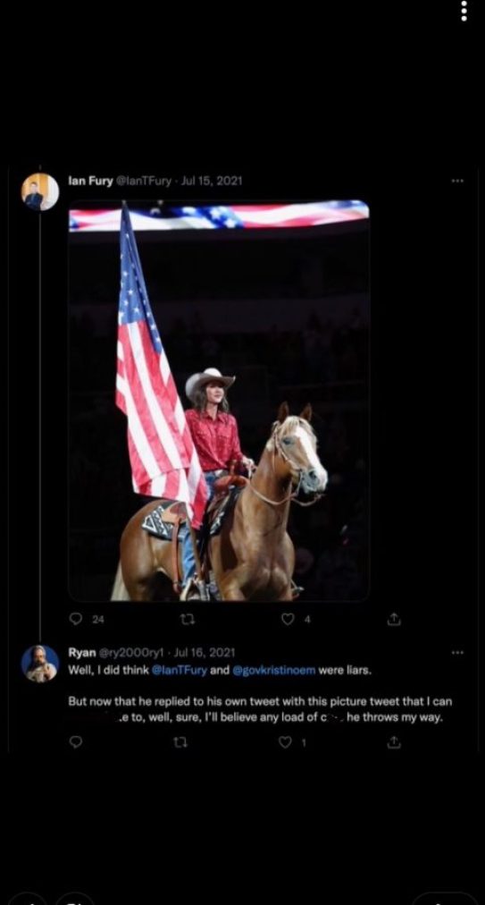 carrying out a sex-related show to a photo of Guv Kristi Noem. Guv Noem’s speaker uploaded an image of the governor riding on an equine along with an American flag and also Ryder advised he will masturbate to it.
